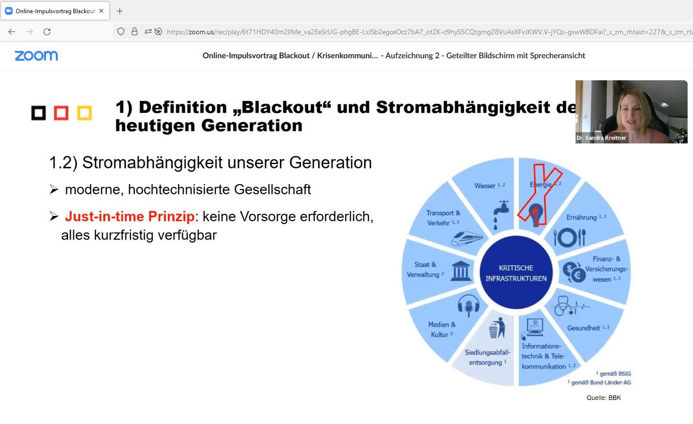 In einem zweistündigen Online-Vortrag informierte Dr. Sandra Kreitner, Notfall- und Krisenmanagerin und Biophysikerin, über den Krisenfall Blackout und seine Folgen.